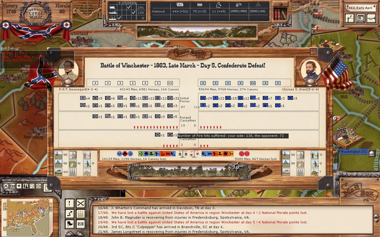 I would check the battle log txt file. Its very possible that Beauregard didnt help Bonham. Was Beaury' command relatively untouched? The numbers of hits suffered in ranged combat indicates the US had a cannon advantage on your troops.