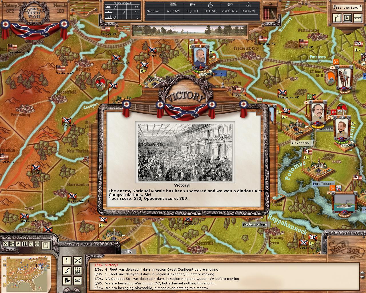 Alrighty, my last AAR was overly short, and I will try your collective advice next time I play as the Union. The big deficiency was trying to write the last one during my lunch break where I could not actually launch the game to review myself. So on this one. I am going to post the pictures of the end result and you can all say whatever you like about what you see in the pictures. If you want more pictures to review, just ask and I will post anything I am able to. Such as perhaps a pic of Polk and his division in Northern, Illinois or images of all the cities that lack depots in his wake. If I go back and attempt to continue this combat, I still want to see if I can take Chicago. In the last turn (i didn't check after the "victory" he was surrounded by superior forces, 3 commanders and could not move to ANY adjacent location. So without further ado, view the pics!