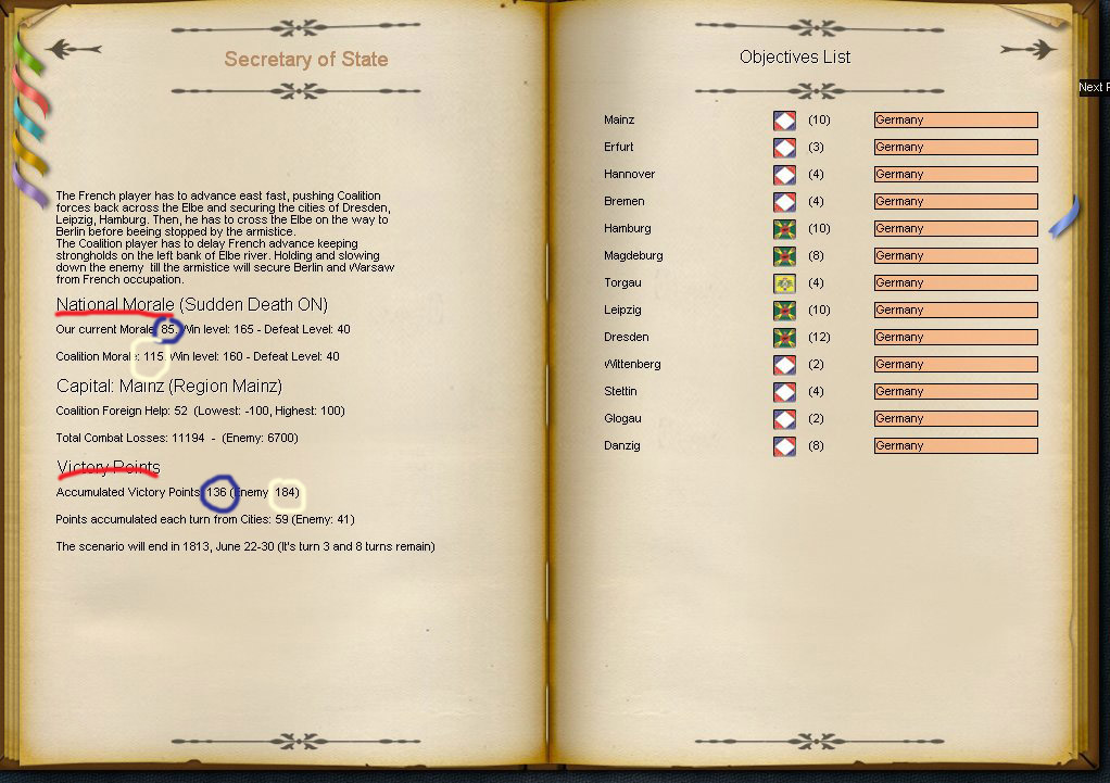 El resultado es este, por primera vez supero en puntos de victoria a la coalición, la victoria de Leipzig compensa la ineficacia en Hamburgo y la rendición de los sajones en Torgau