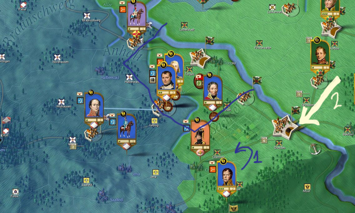 A su vez Napoleon debería tomar primero Torgau para avanzar hacia Dresde, comienzo con aislarlo, capturaré las ciudades adyacentes de Dessau y Wurzer para rodear completamente Torgau antes del asalto
