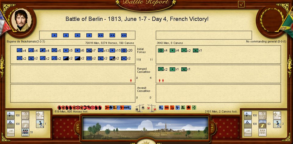 La AI es mucho más pasiva, aunque basicamente mi oponente ha jugado a la defensiva, lo que me permitía tomar rápidamente Hamburgo y avanzar por el norte del Elba hacia Berlín, lo que con el avance de Eugene al sur del Elba se formaba una pinza de efectos devastadores. En este caso mi fallo ha sido no avanzar antes con Eugene tras la falta de resultados en Hamburgo