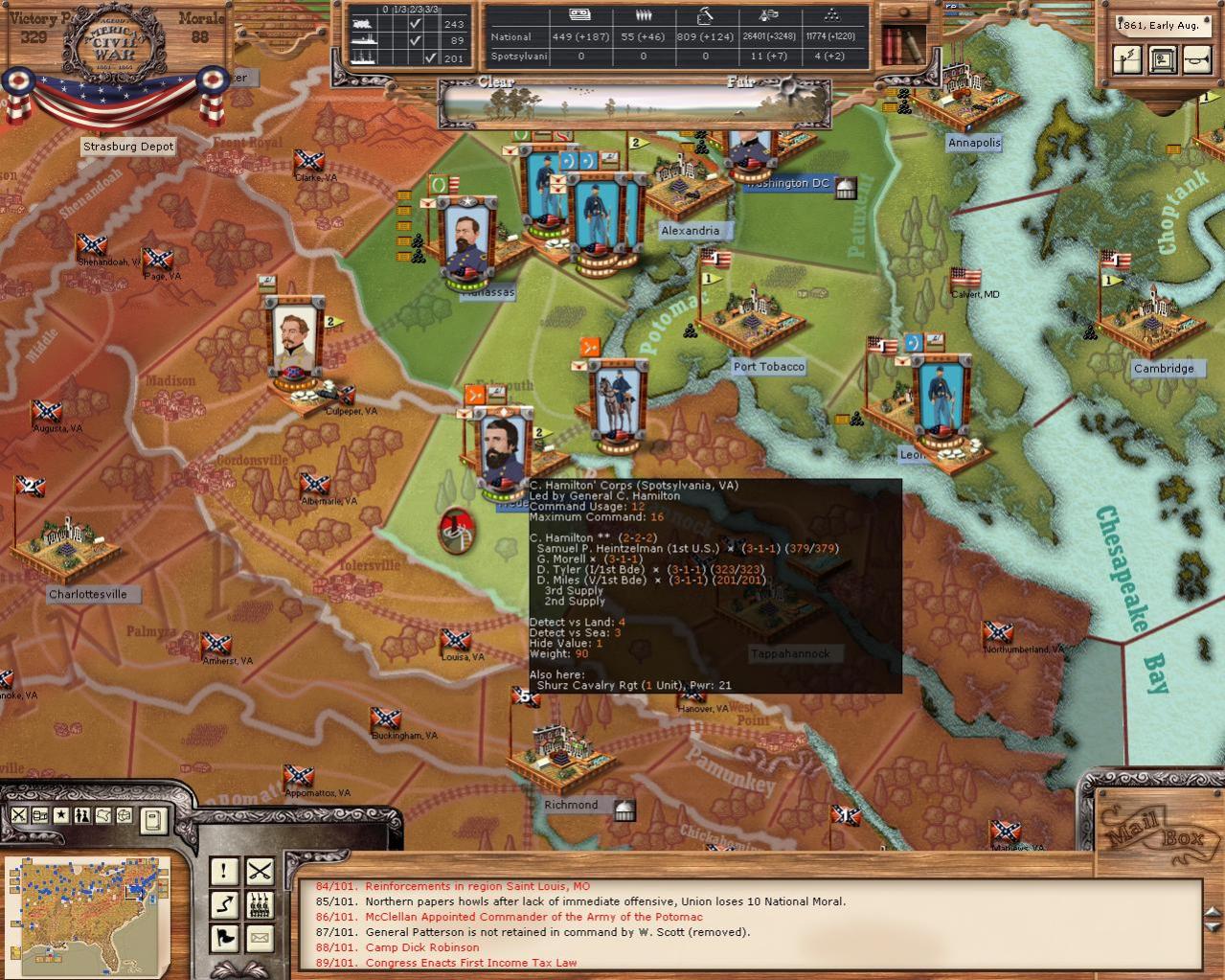 This makes a lot of sense. (I hope for the same kind of wisdom for historical political pressures for the developers of Nap II). In fact a lot of what is in the last posts makes good sense. Believe me, I am one of those who would love to make a move into Virginia. You know I got these huge stacks in front of me with generals I just know will be activated and...well I can just imagine what the papers will say when Jackson's spurs are cutting up the rugs in the White House.