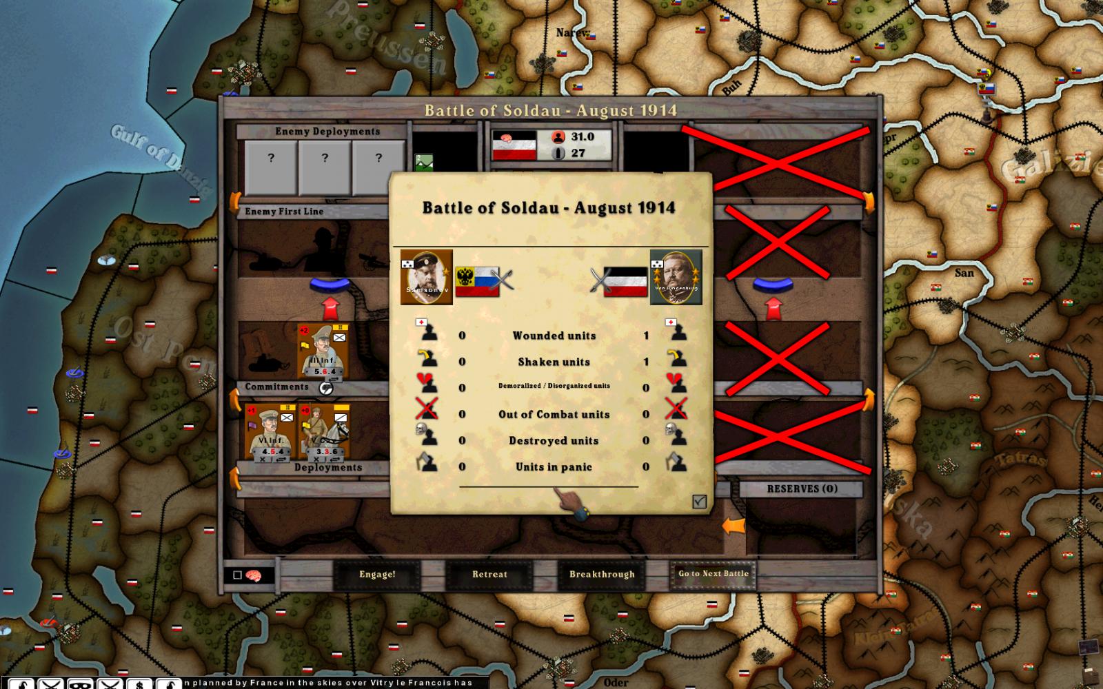 Started the CG as the Entente using 105d (playing WEGO). Overall game is running better than ever :thumbsup: , but I still appear to be getting mandatory retreats when I shouldn't :confused: . See two attached screen shots. In both cases, Russians had additional corps left to commit, and did not take a panic result, but the attacks still ended after just one combat round with a Russian defeat / retreat?
