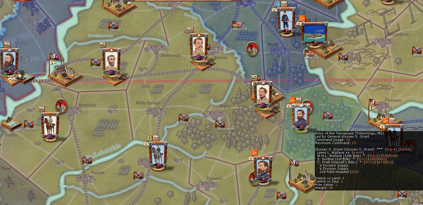 In Mississippi, the USA advance from the South is in full swing. The attacks come from the river. Port Hudson and Baton Rouge have fallen. Forrest remains entrenched at Springfield. In the North, Crittendon's Corps has arrived at Grant's location. A USA offensive seems inevitable aimed towards Corinth and Memphis.