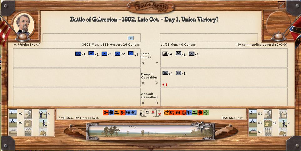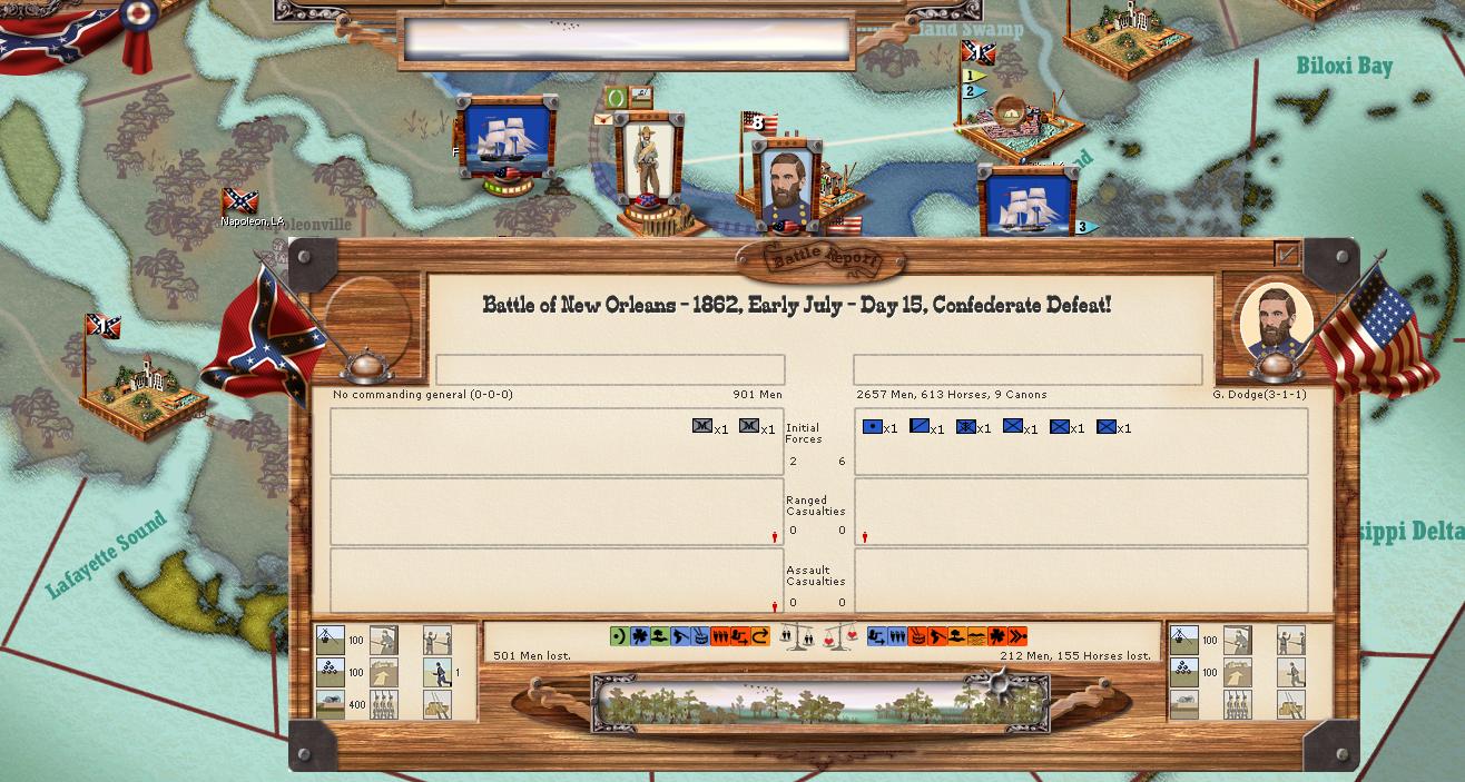 USA Army of the West captures Fayette AR. USA forces are once again repuled at Galveston. Crittendon's Corps moves towards Vicksburg, Jackson falls. Other theatres remain quiet, but the Mississippi and Arkansas managed to slip by USA naval elements into Mobile Bay. Notably, USA has taken point lead and the casualty gap is growing.