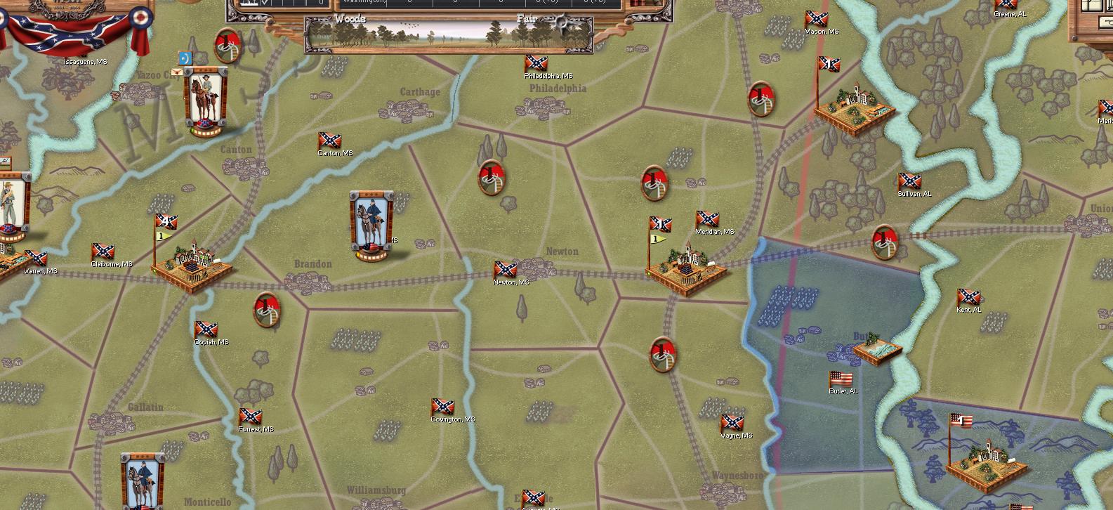 In Mississippi, the USA advance from the South is in full swing. The attacks come from the river. Port Hudson and Baton Rouge have fallen. Forrest remains entrenched at Springfield. In the North, Crittendon's Corps has arrived at Grant's location. A USA offensive seems inevitable aimed towards Corinth and Memphis.