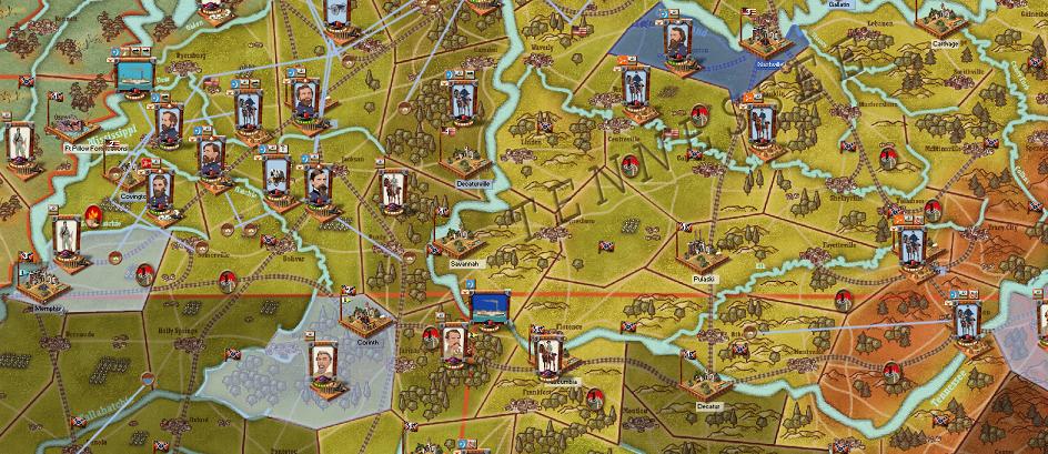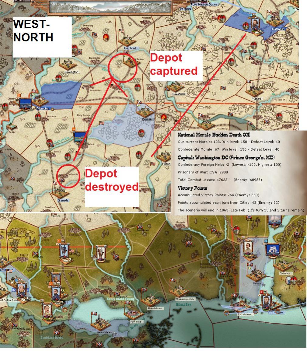 Frozen weather at turn one around Memphis told me there will be no rapid advance so I decided to strengthen up and move when weather improve. After battle of Corinth where Union army of 50000+ lost to CSA army of 25000 I decided not to waste time with well entrenched rebels and went for weakly defended Chattanooga. In the meantime Butler arrived at New Orleans which was defended by rather strong force under Polk. Landing there was out of the question so I decided to knock out forts first to get supplies, points and clear the way for navy than turn on Mobile. That drew Polks attention who left New Orleans practically undefended and Dodge with some 3500 troops seized the opportunity. From than on it was basically playing for points by holding objectives and strategic towns. At last couple of turns I managed to take Memphis and even capture Beauregard's HQ but Breckenridge escaped engagement twice.