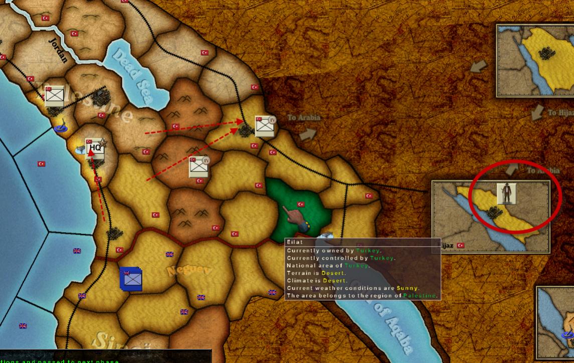 No action by either side, but Turks do send TU IV Army from Damascus to Jerusalem, in case the Brits get frisky. See image.