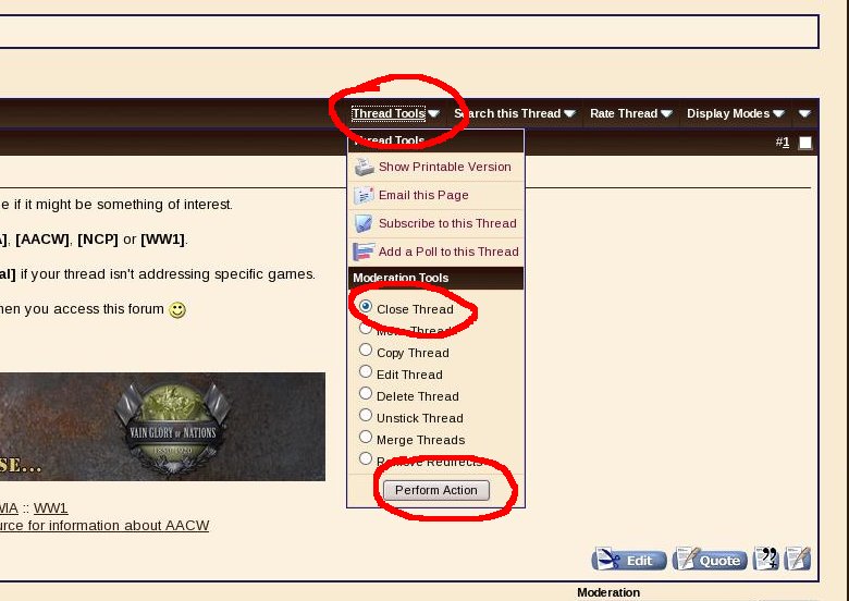 ). Make sure that "Close Thread" is chosen and the click "Perform Action". Voilà! Thread closed.