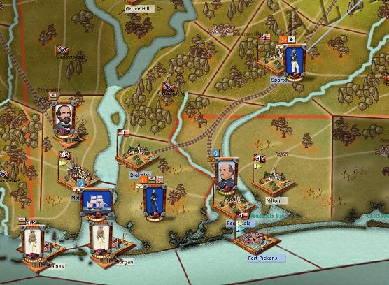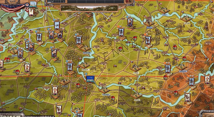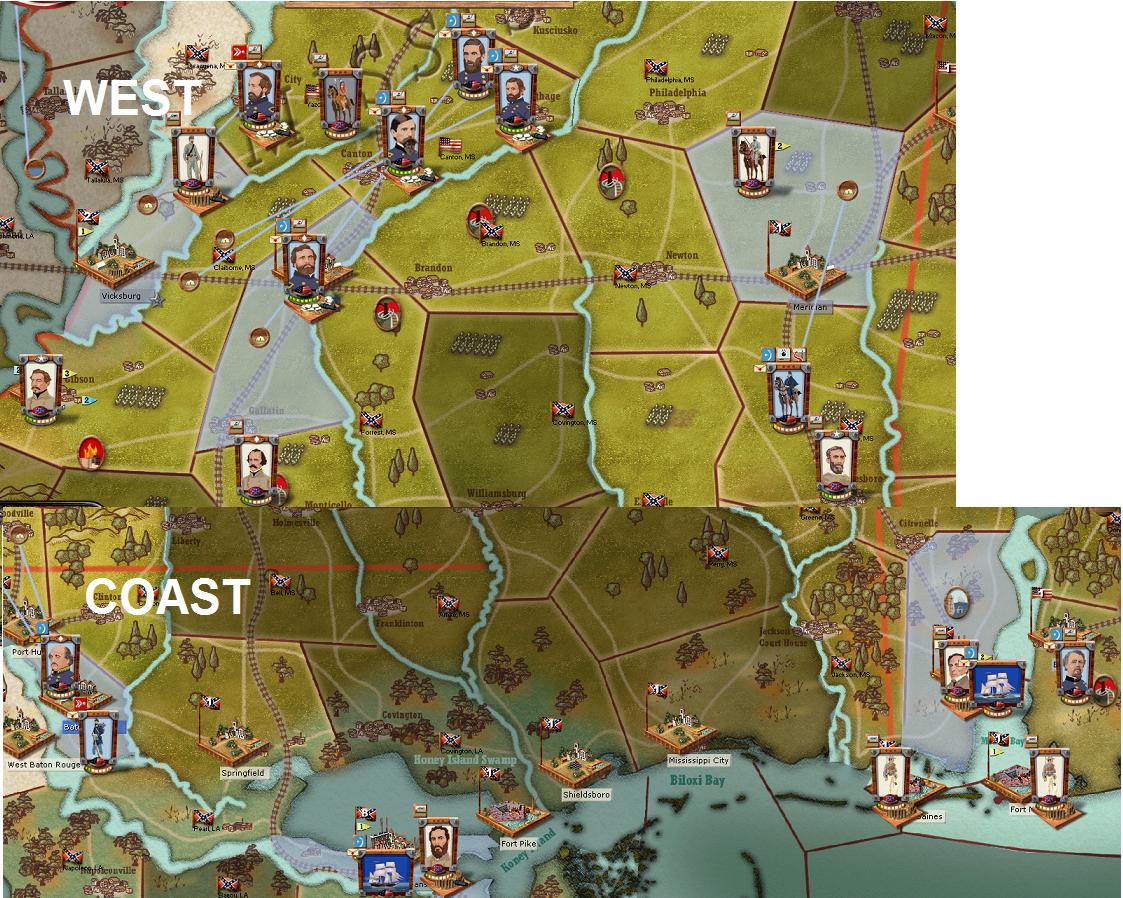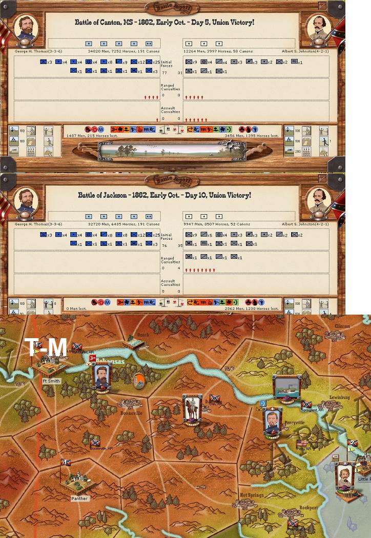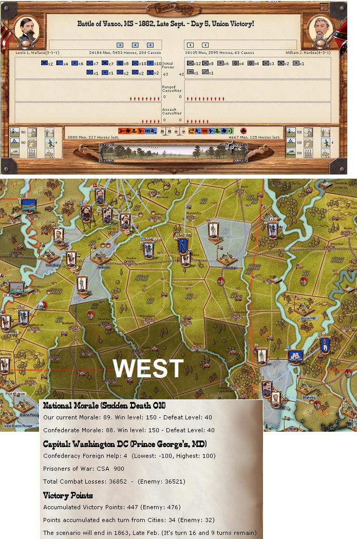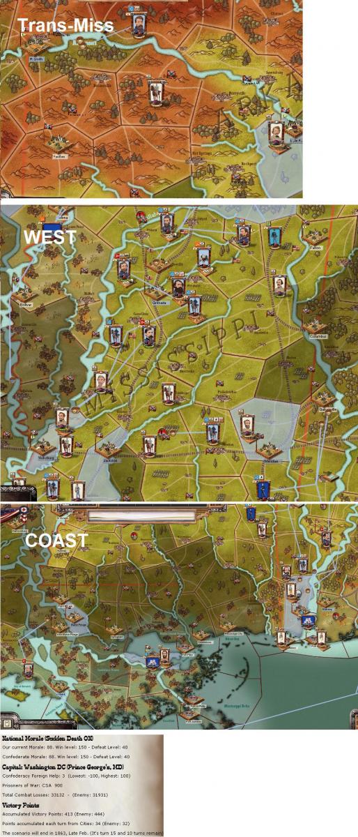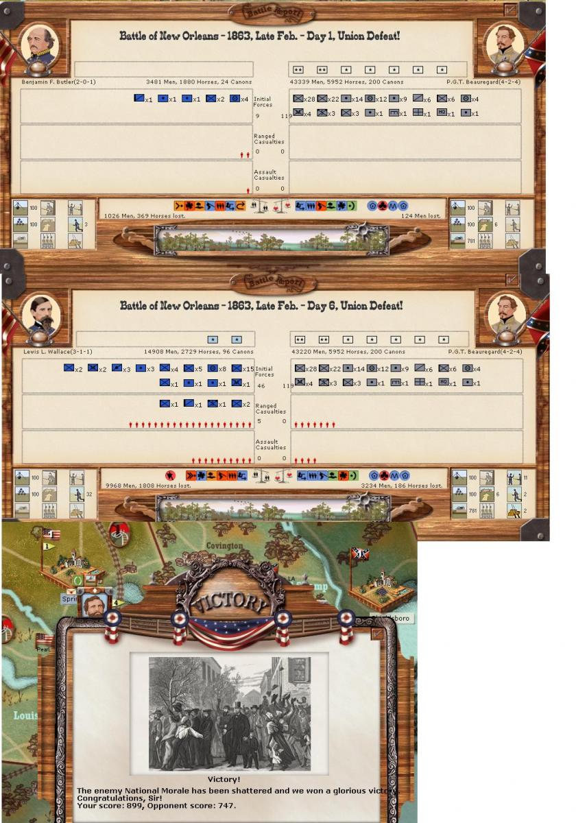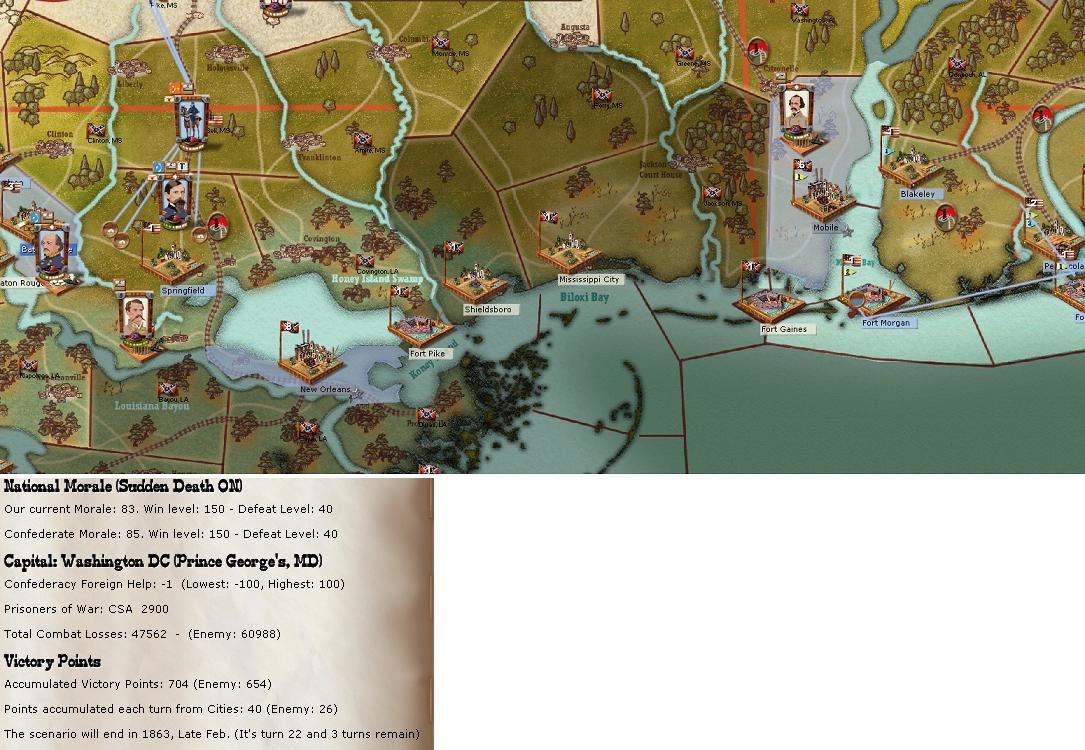 Frozen weather at turn one around Memphis told me there will be no rapid advance so I decided to strengthen up and move when weather improve. After battle of Corinth where Union army of 50000+ lost to CSA army of 25000 I decided not to waste time with well entrenched rebels and went for weakly defended Chattanooga. In the meantime Butler arrived at New Orleans which was defended by rather strong force under Polk. Landing there was out of the question so I decided to knock out forts first to get supplies, points and clear the way for navy than turn on Mobile. That drew Polks attention who left New Orleans practically undefended and Dodge with some 3500 troops seized the opportunity. From than on it was basically playing for points by holding objectives and strategic towns. At last couple of turns I managed to take Memphis and even capture Beauregard's HQ but Breckenridge escaped engagement twice.