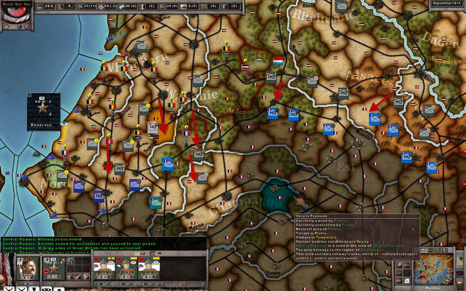 Germans end the pre-turn in pretty good shape, but have to do a lot of rail line converting with GE II Army in August. In August, I usually end up with GE I and GE III in the lead on the German right wing, with GE II bringing up the rear and converting rail lines and such. The GE II Siege guns can be handy at Antwerp or Maubeuge, or even down in the southern part of the front at Verdun or Nancy, if you can rail them down there.