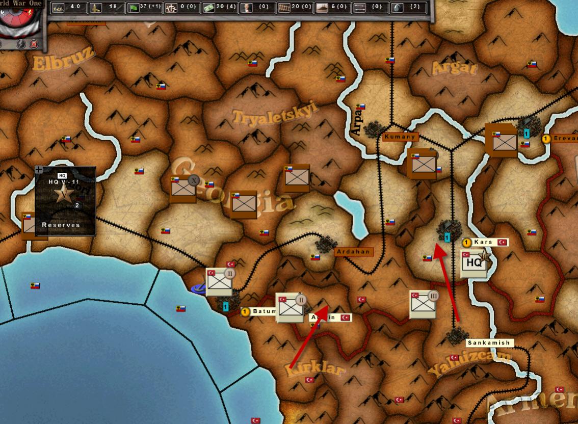 No action by either side, but Turks do send TU IV Army from Damascus to Jerusalem, in case the Brits get frisky. See image.