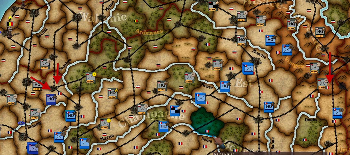 FR I and FR II attack in accordance with Plan XVII at Colburg and Saarbourg. Both attacks are not pressed home, ending after 4 rounds with both sides taking some losses, the French slightly more. FR III and FR IV do not attack at all.