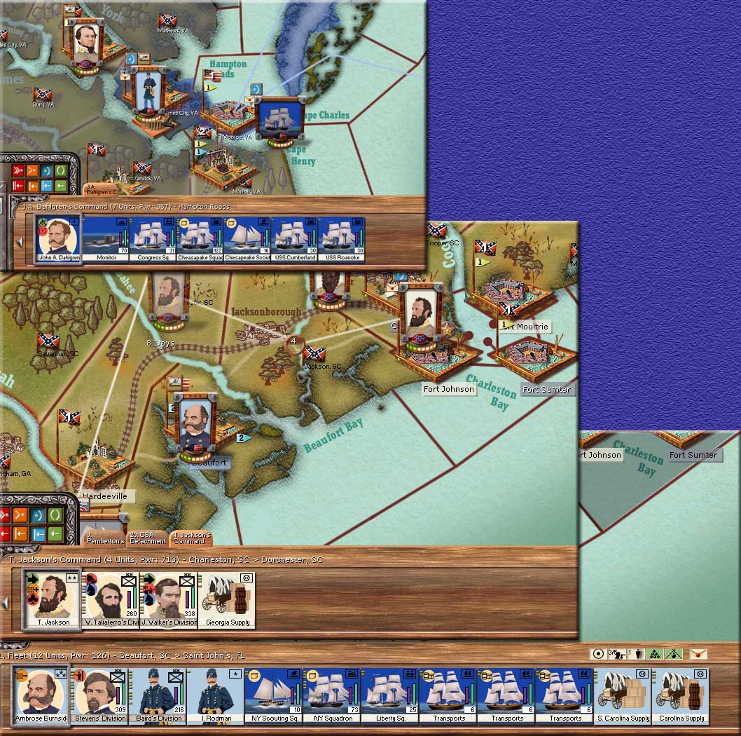 In the southern coastal regions USA sixth Fleet has arrived at Beaufort South Carolina, bypassing the defenses of savannah. This is Burnside's command. The fleet has orders to head south and merge with the 4000 Union troops in Florida. That location is under the direct command of corps commander J. Dix. Thomas Stonewall Jackson has been placed in command at Charleston. Arriving to reinforce him is John Walker's division swelling Jackson's command to 13,000 troops. This force has orders to move to the river opposite the Union invasion point - the Combahee. Pemberton is taking a couple thousand troops and heading north towards Fredericksburg to merge with the main CSA Army.