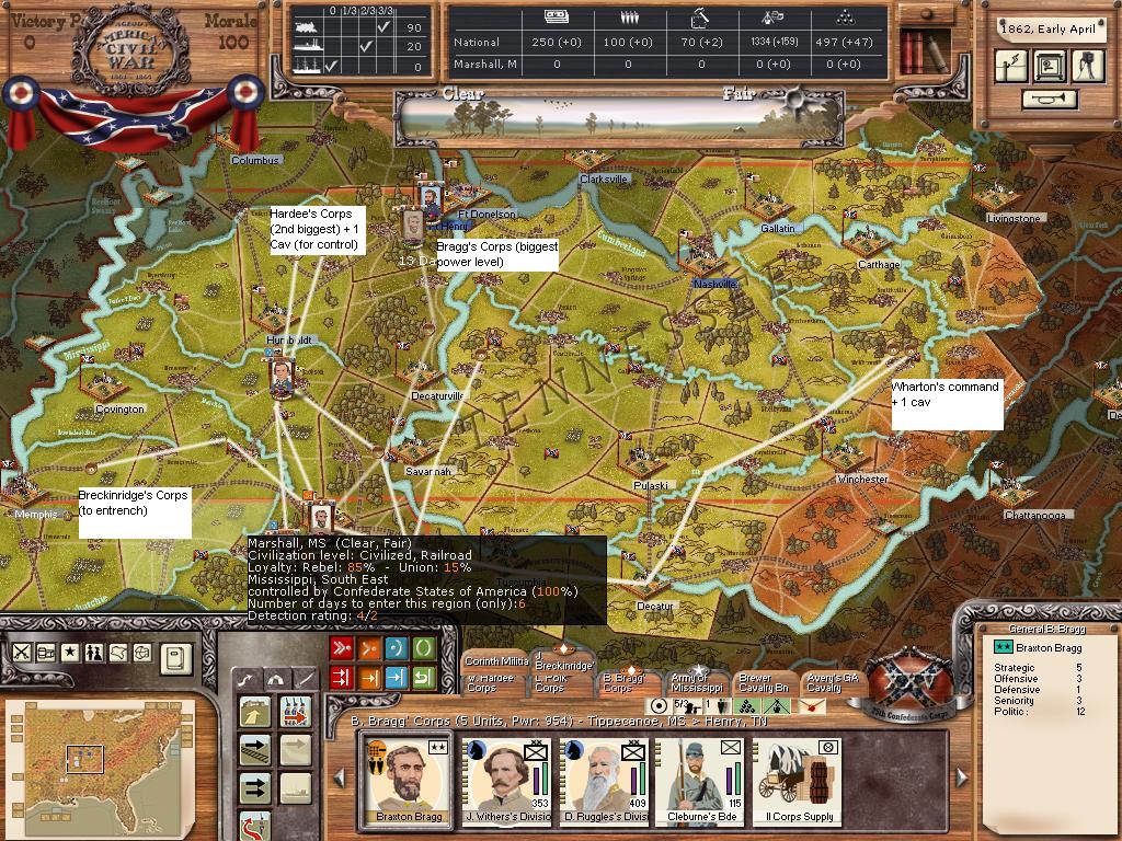 Everyone starts together in a large pile hanging out at Tippecanoe, MS (I must do something about that), so I have moved a lone cavalry unit to Gibeon, TN to gain a more MC (before I move other units into). I have decided to move Bragg's Corps to assault Grant at Henry TN. I have ordered Hardee's Corps to Gibeon TN (to support Bragg's assault). Breckinridge's Corps has moved to Memphis (to dig in - just in case). Polk's corps will be moved on the east side of the river to threaten both Nashville and Fort Donaldson. Wharton and Forrest's command has been railed southeast of Carthage (for a special purpose :D ).
