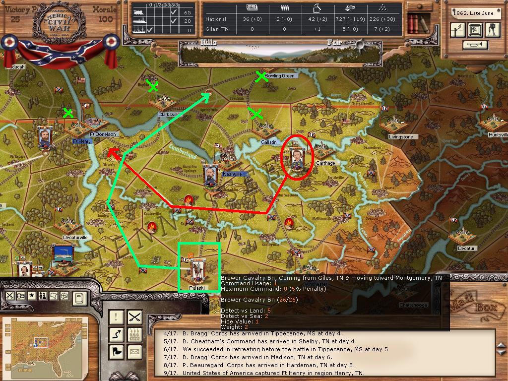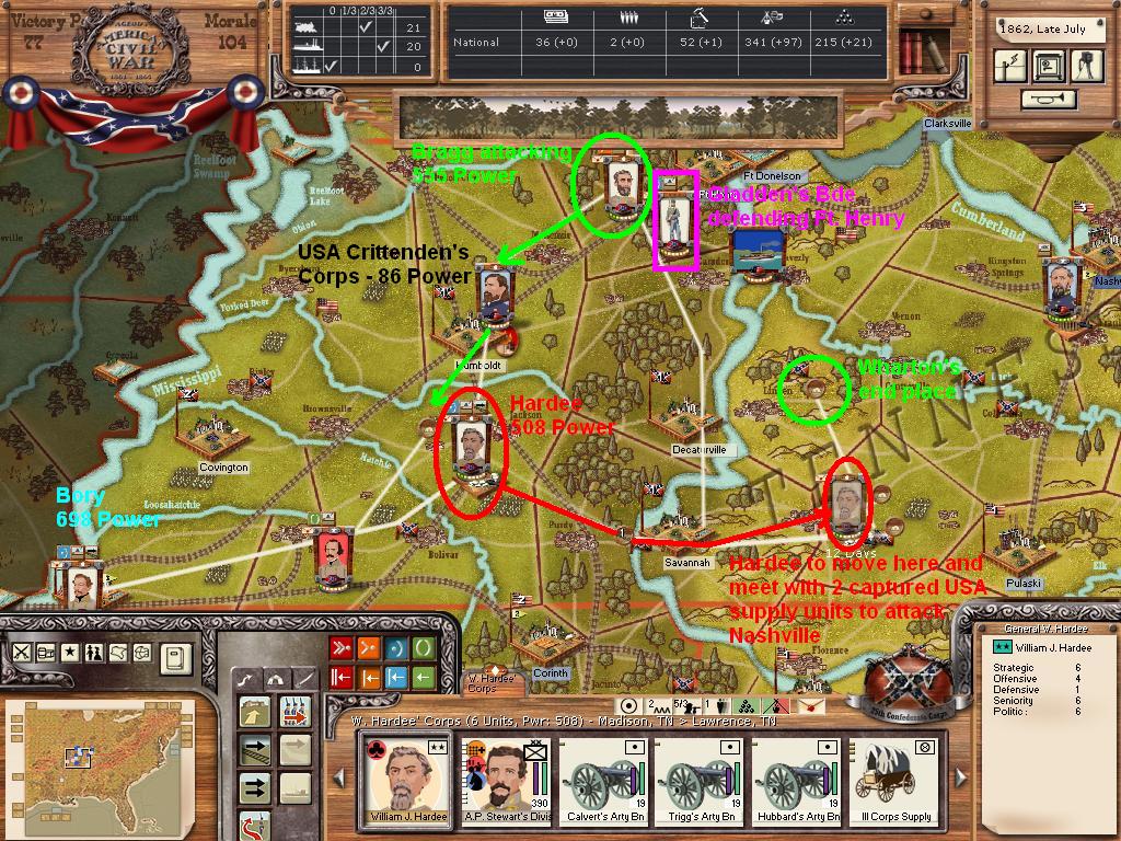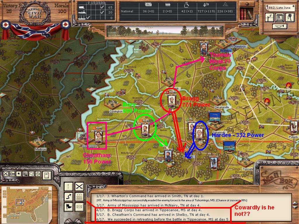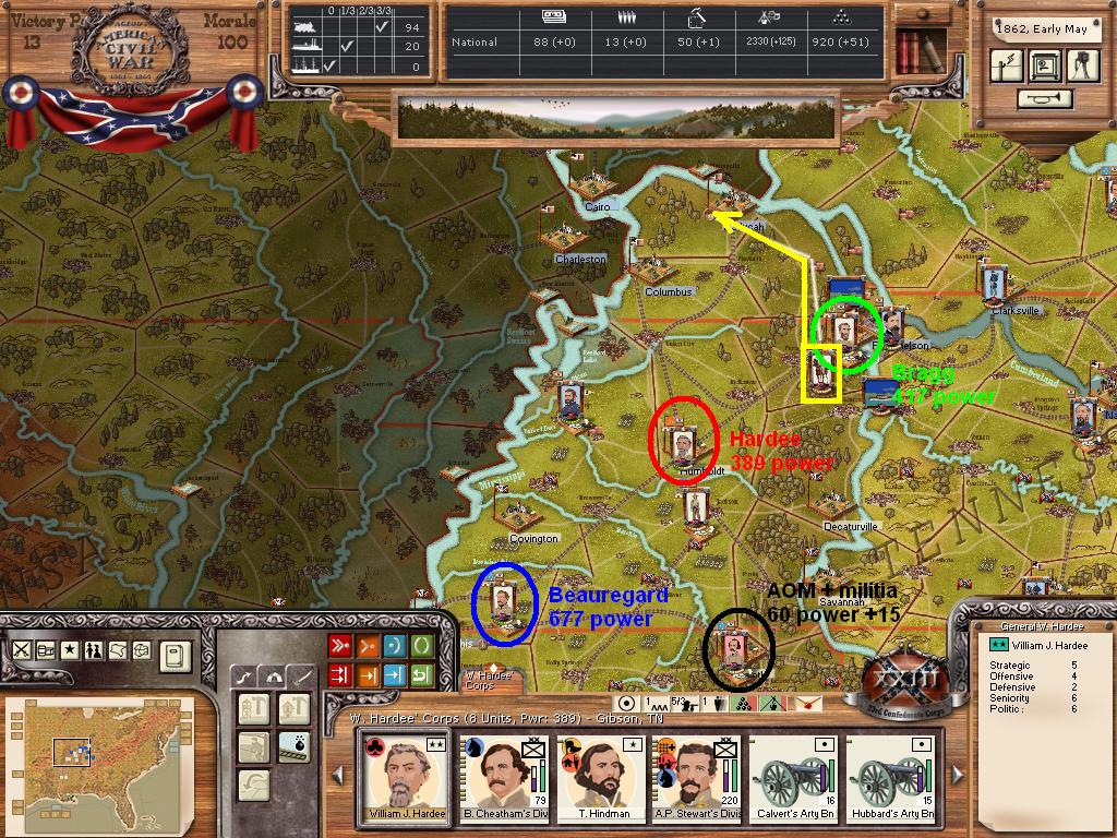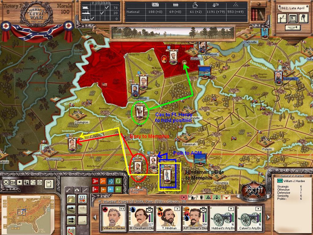 I have color coded the moves. Beauregard ([color="Red"]in red[/color])will move to Memphis to take over the Corps (I plan on making a division with Breckinridge). The Hindeman Brigade will march to Memphis to join old Bory (in [color="Yellow"]yellow[/color]/black). Polk with a Militia unit(who is not a good leader in my opinion, is moving to the AOM to assist AS Johnston ([color="Navy"]in blue)[/color]. Brewer's Cav will move to Ft. Henry to help hold it (it is a strategic city after all). Hardee's Corps will hold position (due to Grant being there). Bragg will hold position to recover Cohesion and help Hardee (via MTSG). A note: I have moved Bory to Memphis, as this is the union objective, and I really need to hold it.