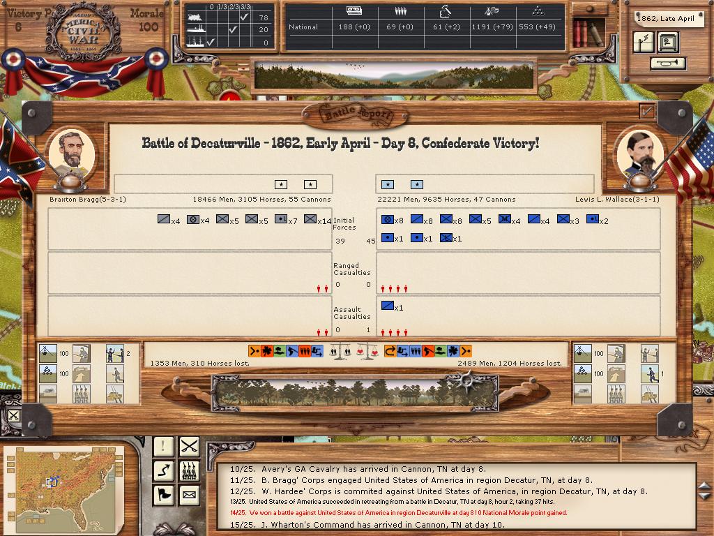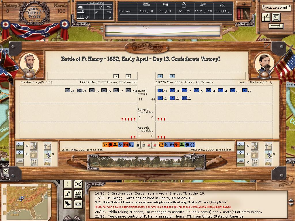 After Bragg nailed Wallace in Decaturville, he marched behind Wallace into Ft. Henry. The following battle occured. From the results, it looks like Wallace fled at the 2nd hour, and took an extra 17 hits for it. It does not look like there was any MTSG during this battle.