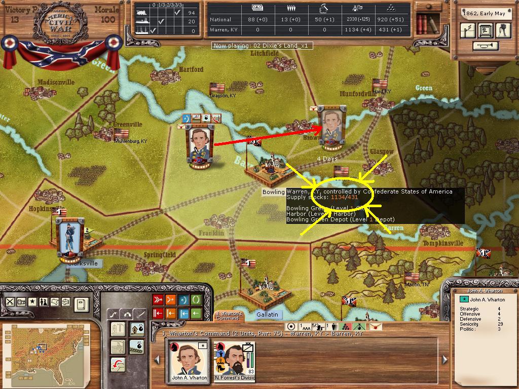 Here we have Wharton's move. I am planing on causing my enemy supply problems, by capturing Bowling Green. I hope this ends the scenario with my victory. I am pretty sure Doomwalker doesn't see it coming, as my hide value (in the red box) is 5, and his detection value for Nashville is a 4 (which makes it a 2 or so where I am located).