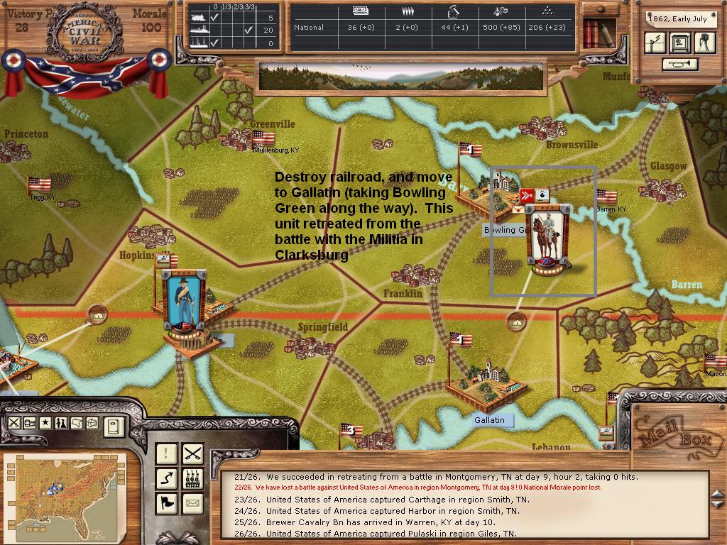 The CSA has to be somewhat aggressive in these short scenarios. You can not simply sit back and allow your enemy to dictate the battle. You will note, that to win, I must hold Bowling Green, while keeping Memphis. If I simply sit back and defend Memphis, I can never win.