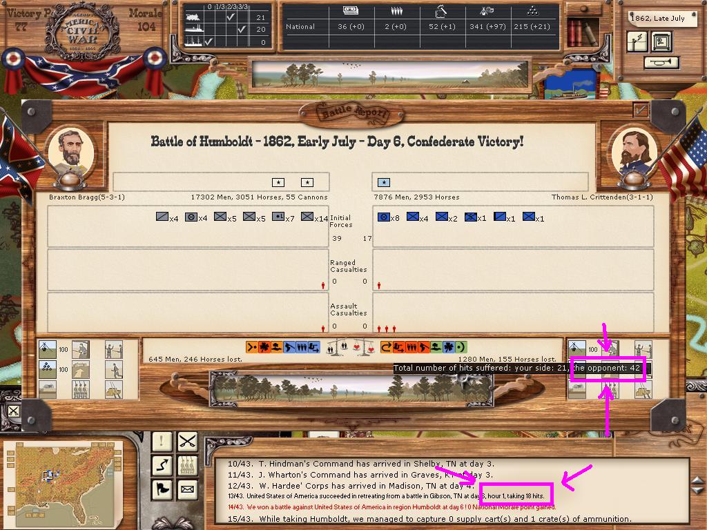 I want to show how much more damaging retreating can be than the actual battle. I have hit my opponent for "hits" during battles I won (and caused damage during the retreat), but a whopping 62 during retreats. That's just under 4 times as many. If you look at the flavor numbers, I have managed to inflict approximately 4,800 causalties (in men). That would mean approximately 1,000 more casualties were taken during retreats.