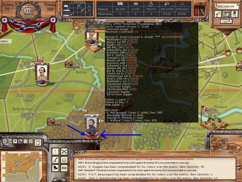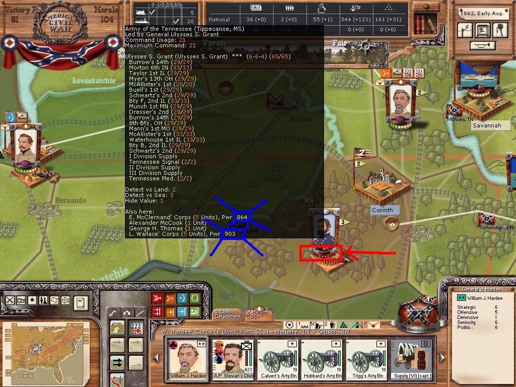 Jim-NC wrote:Here we have Grant's army. He is now dug in at Corinth with a sizable force (approx. 1900 power). If you look at my units I have the double arrow icon circled. This time, no MTSG, everyone is moving in sync (one hopes). I really need to get him out of Corinth. I am gambling that he will not attack Memphis.