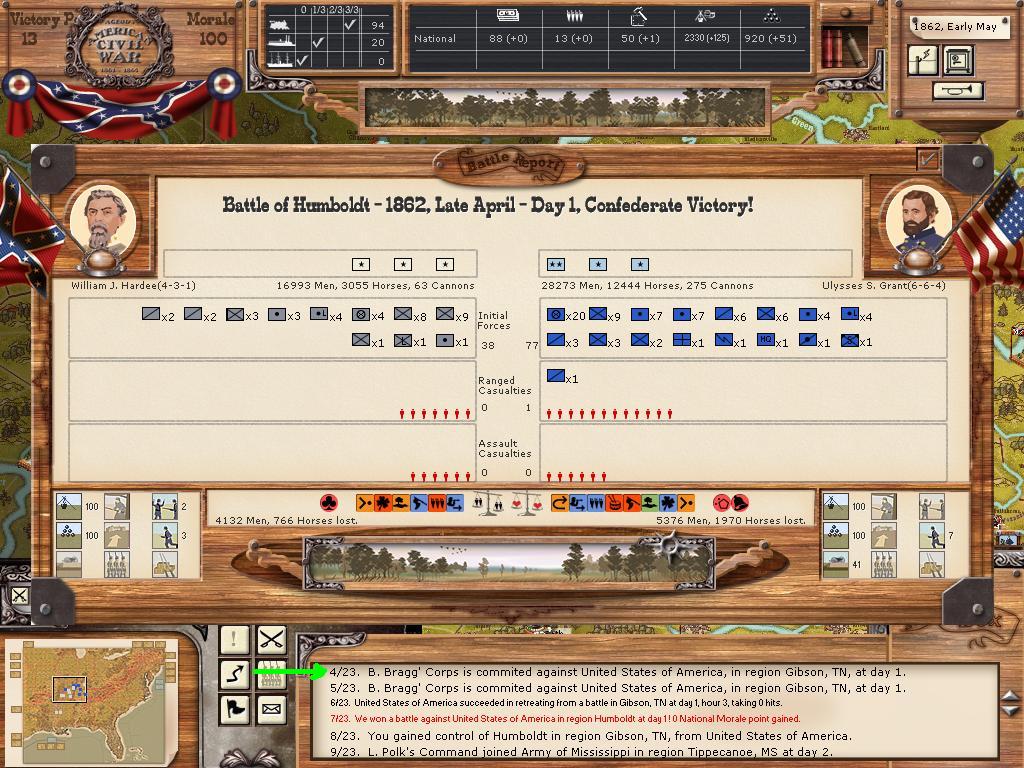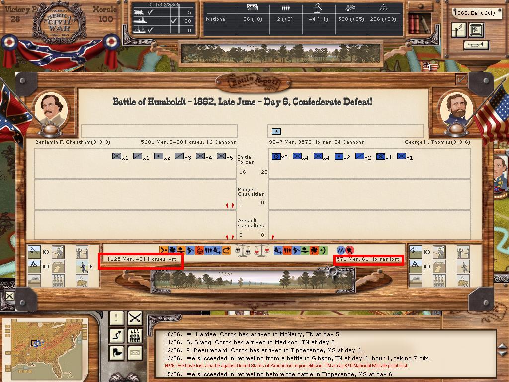 Next up the slightly more important battle of Humboldt. Somehow Crittenden moved up, and got whacked by Bragg's Corps. Once again, the retreat got ugly for the union. He took 42 hits during combat, and then 18 more during the retreat. I think he retreated back to Ft. Henry, but cannot tell due to the lack of a replay.