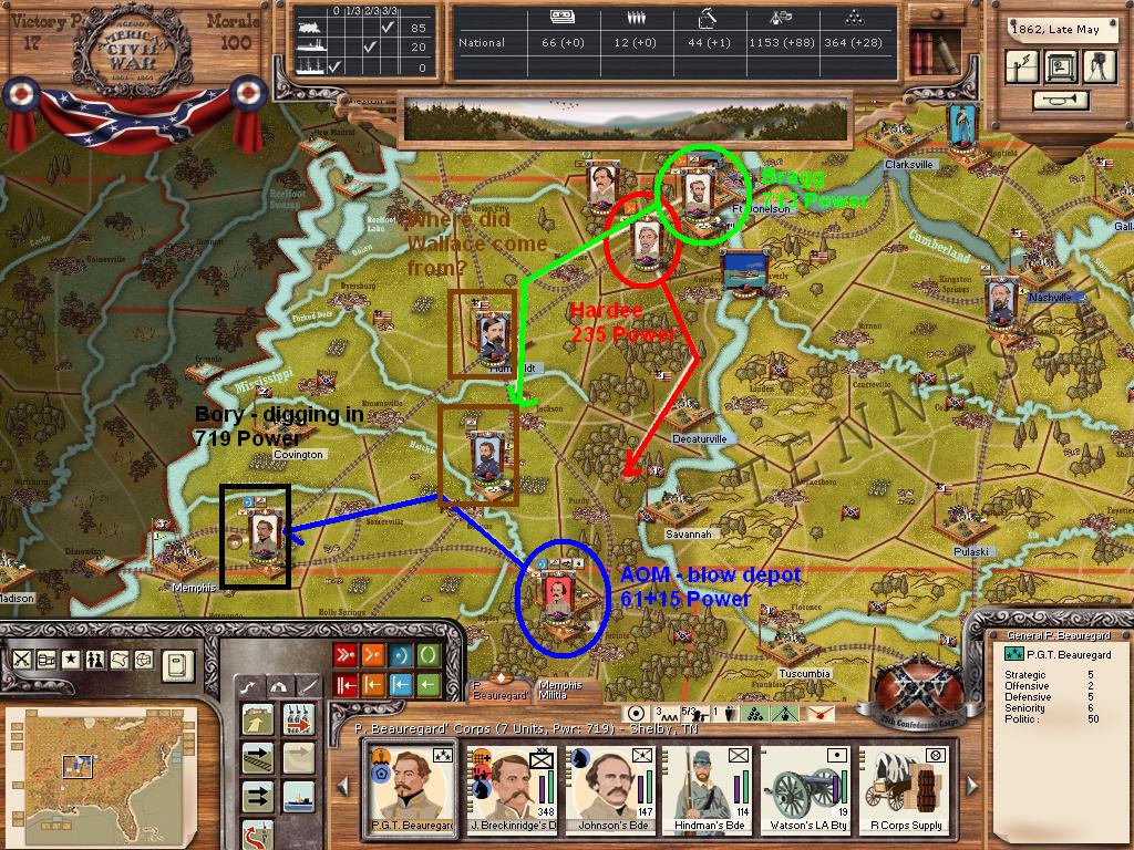 I have color coded the moves. Beauregard ([color="Red"]in red[/color])will move to Memphis to take over the Corps (I plan on making a division with Breckinridge). The Hindeman Brigade will march to Memphis to join old Bory (in [color="Yellow"]yellow[/color]/black). Polk with a Militia unit(who is not a good leader in my opinion, is moving to the AOM to assist AS Johnston ([color="Navy"]in blue)[/color]. Brewer's Cav will move to Ft. Henry to help hold it (it is a strategic city after all). Hardee's Corps will hold position (due to Grant being there). Bragg will hold position to recover Cohesion and help Hardee (via MTSG). A note: I have moved Bory to Memphis, as this is the union objective, and I really need to hold it.