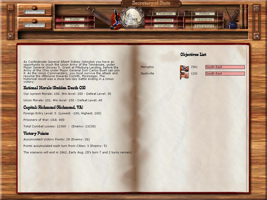 The CSA has to be somewhat aggressive in these short scenarios. You can not simply sit back and allow your enemy to dictate the battle. You will note, that to win, I must hold Bowling Green, while keeping Memphis. If I simply sit back and defend Memphis, I can never win.