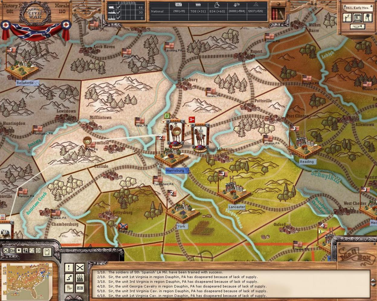 also the second screen shot was taken after a turn's rest as cohension was getting low and I wanted them to be able to attack Harrisburg. But the two previous turn the cav was in assault mode.