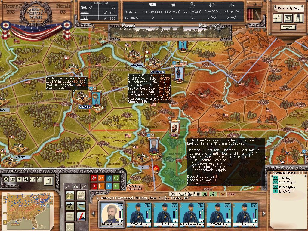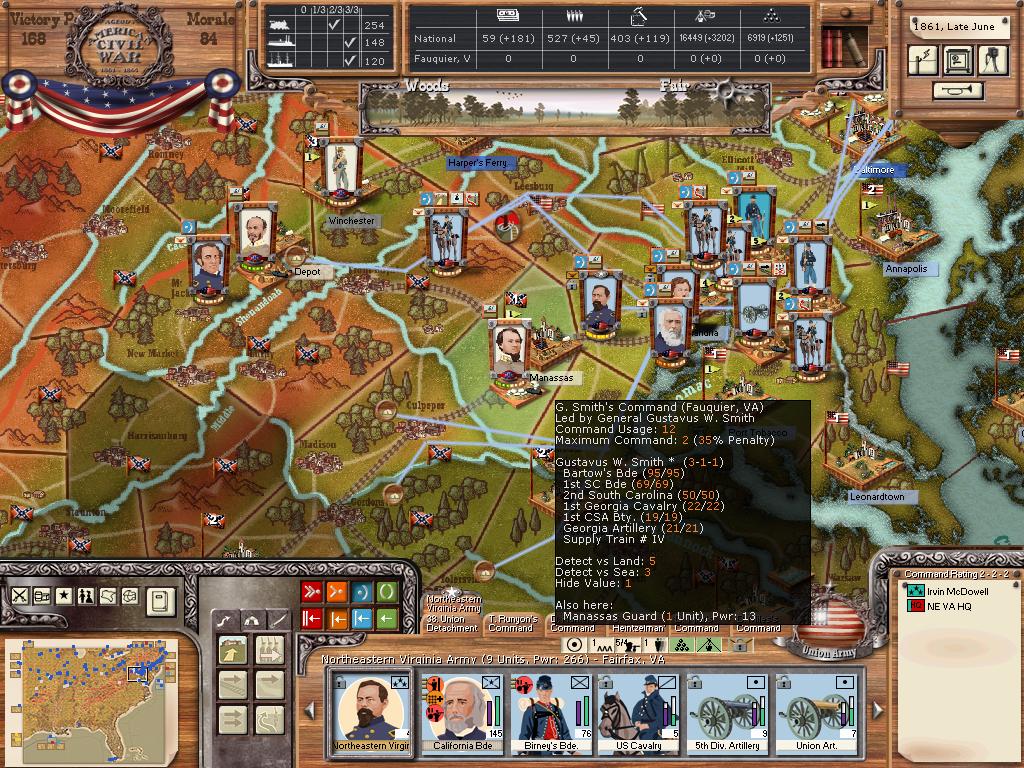 As for amphibious operations in '61...I'm not playing anything major at all. Reinforcing Ft. Monroe in order to keep my foothold on the peninsula is all. My main task is going to be protecting Washington, Annapolis, and Baltimore from the likes of Jackson.