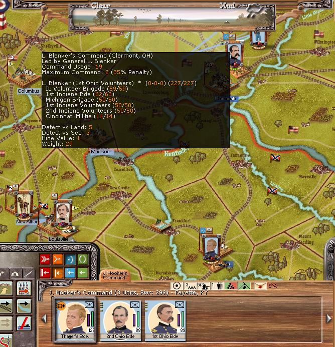 Well MrT seems to be going after Kentucky in strength! McClellan will continue training the mountain corps so all that's is free to oppose the rebels is 3 bde's under hooker. He'll remain at Lexington for now I'd like to see how far MrT will push into KY. I may be able to swing around his forces once division formations open up.