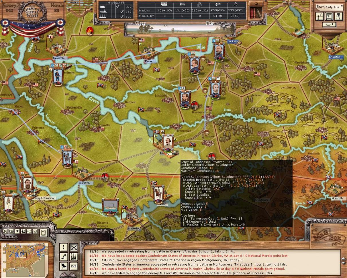 The army is beginning it's advance on Bowling Green. Unfortunately, a few turns ago I had river transports on the way to construct a depot at Henderson, kY, however they were sunk! I'll repair the rail lines as I move south and build a depot later. I think there is ample supplies for a few months anyway...