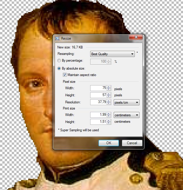Open the picture of Napoleon in Paint. To work better, as it is a full body picture, cut the head and neck using the rectangle select tool. Now with that selected, edit and paste in as new image. You will have something like this. You have to look carefully at the original graphics so that only are shown the head and the neck