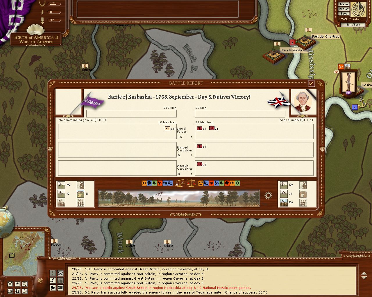 The Michilimackinac garrison repel a sizable Indian force but take 50% casualties. The Indians will be back.