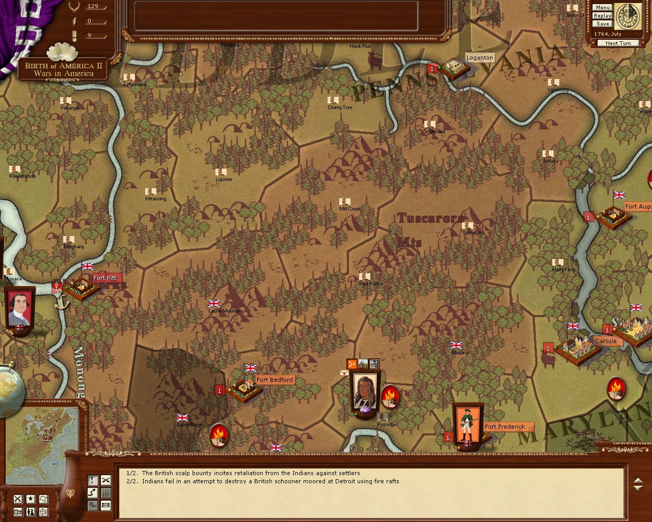 May/June '63. Screen showing quite a few events. Fort Pitt is under siege and Indian raiders approach the settlements at Greenbrier.