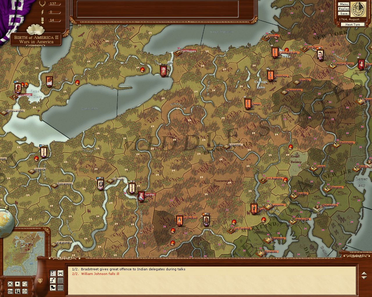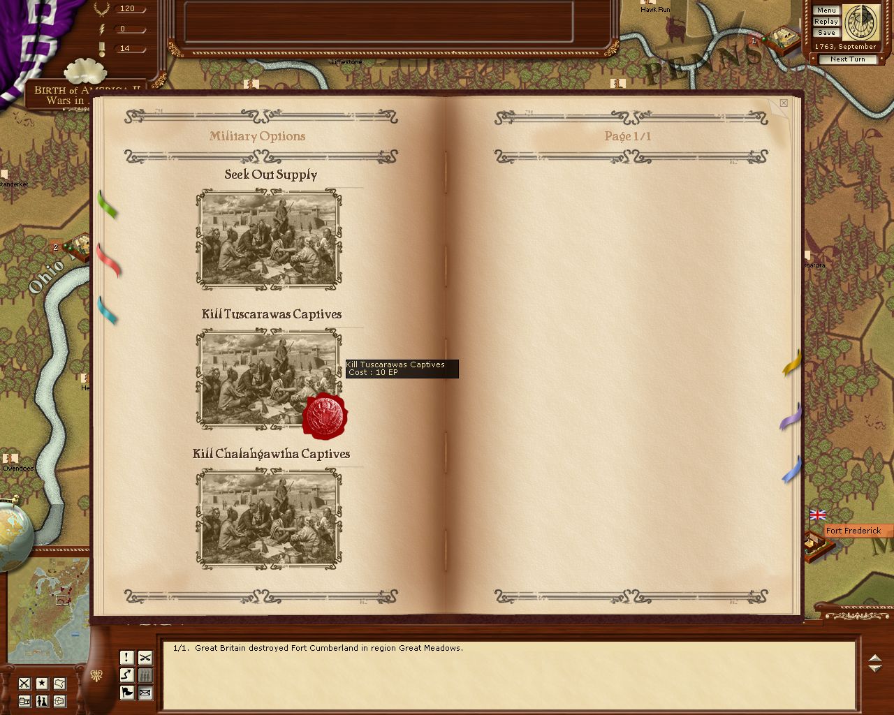 May/June '63. Screen showing quite a few events. Fort Pitt is under siege and Indian raiders approach the settlements at Greenbrier.