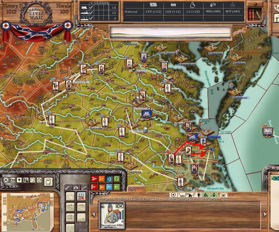 I saw the weather was only good for marching in the regions between Petersburg and Norfolk so I did end up warping Reynolds, who was with Hooker, to Suffolk. I did get attacked there.