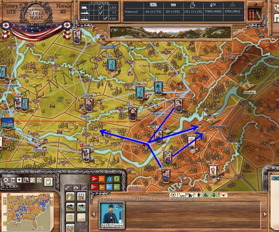 AOP charges Fredricksburg with 3 Corps in tow (going for the ANV). AOC moves towards Chattanooga via Winchester. AOT is moving corps south to crush Gardner's corps. Some corps moving NE towards Jackson. Mississippi Command is pushing towards Mobile.