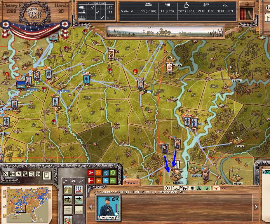 AOP charges Fredricksburg with 3 Corps in tow (going for the ANV). AOC moves towards Chattanooga via Winchester. AOT is moving corps south to crush Gardner's corps. Some corps moving NE towards Jackson. Mississippi Command is pushing towards Mobile.