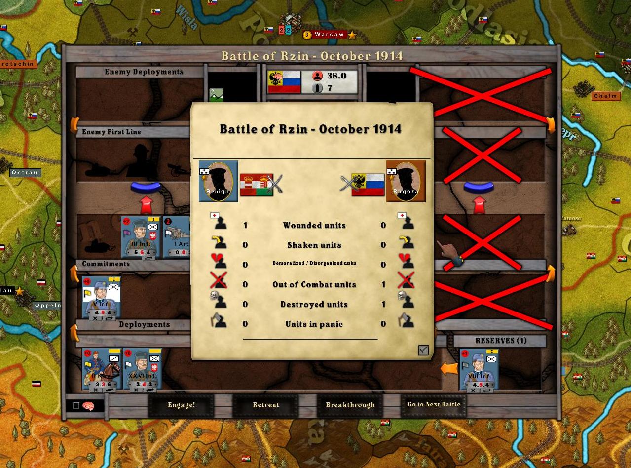 The 1st Army continued its run of good fortune. The Russian Army at Rzin looked large, but gave way quickly at little cost to the 1st Army.