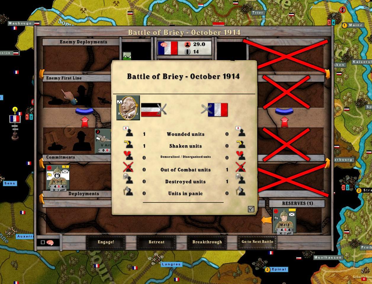 The 4th Army did very well in driving a significant French force out of Reims. Further, it broke through and crossed the Marne. This opens up the possibility of the 4th Army reaching Paris also next month. The 4th now has an issue of a possible exposed flank as the French were not driven out of Soissons. That task was assigned to the 3rd Army, but they never reached that objective.