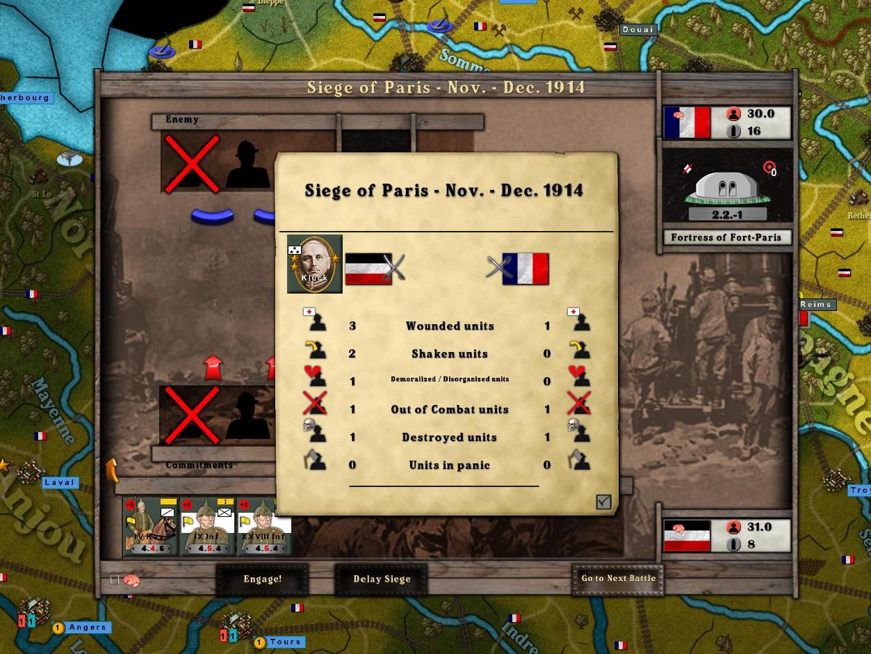 Going into this situation without siege artillery makes it difficult to count on victory. Siege artillery was en route from Belgium with a detach corp from the 2nd Army, but they were still far away. In any event, the 1st Army was close enough to possibly make a decisive push. Under this circumstance, the infantry were going to have to carry the battle-and eliminate the forts. This is a very expensive way to fight. It would be foolish except in the circumstances of ending the war. (in the game, capturing Pris before 1915 is an automatic victory).