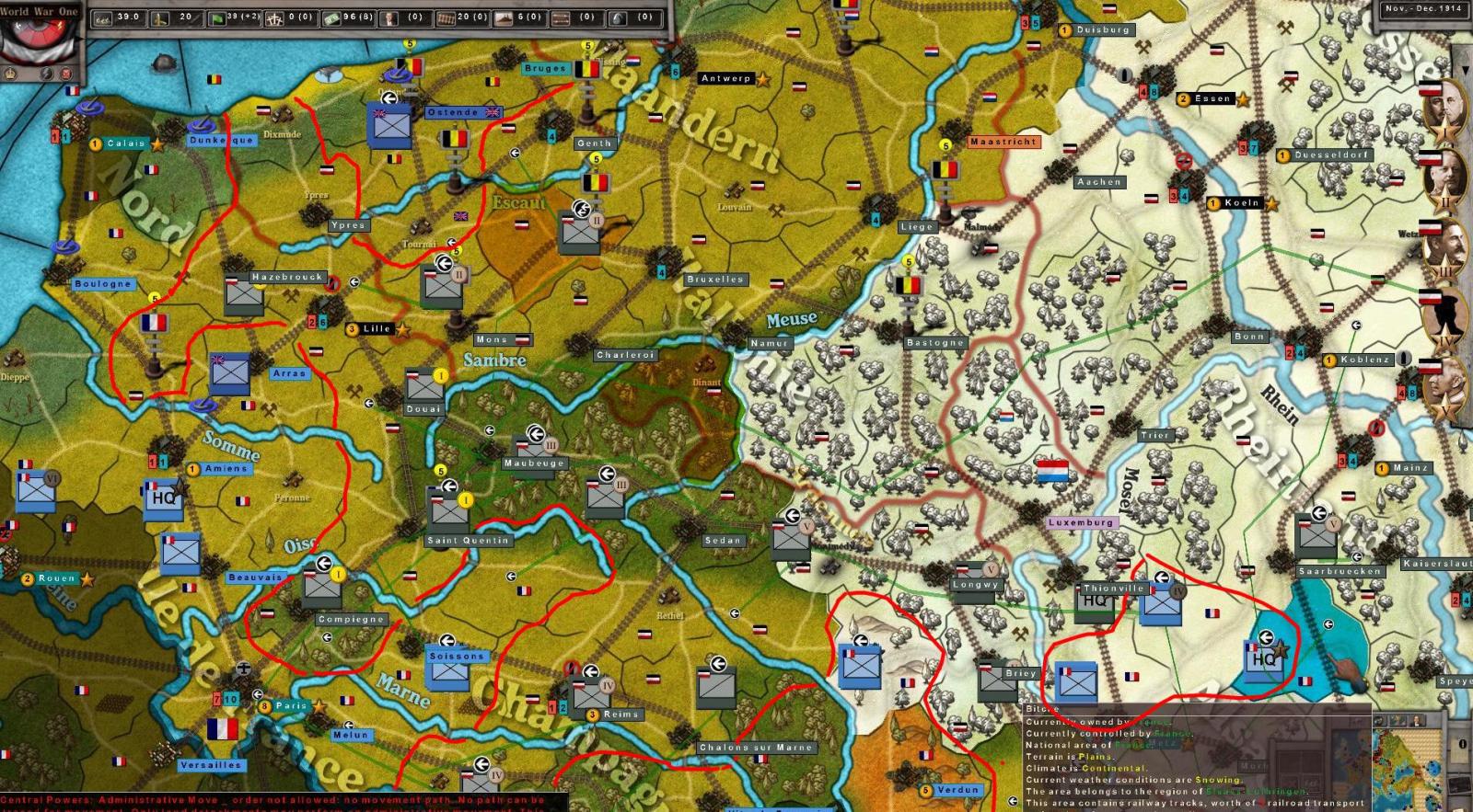 The Western Front does resemble the historical campaign somewhat. The 2nd Army is now way out of position, but this could be a benefit for Germany in building the northern front. The French move into the Rhineland is another twist. The fall of Metz is not too unusual, but the move further north is-my fault. I could have used reserves from someplace to maintain the front-lesson re-learned.