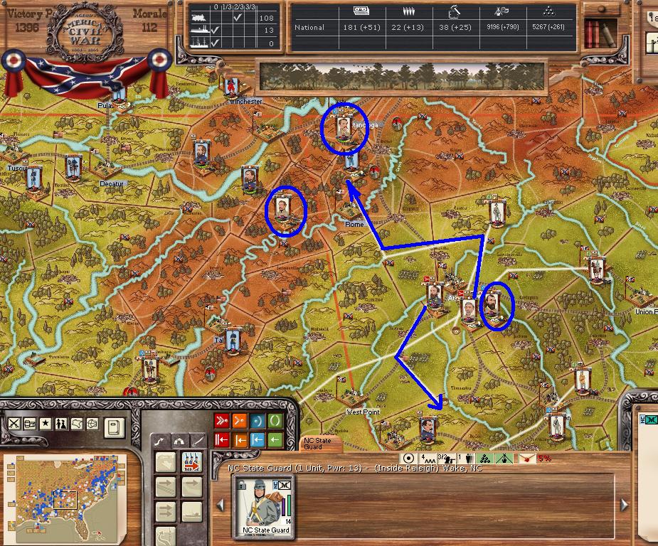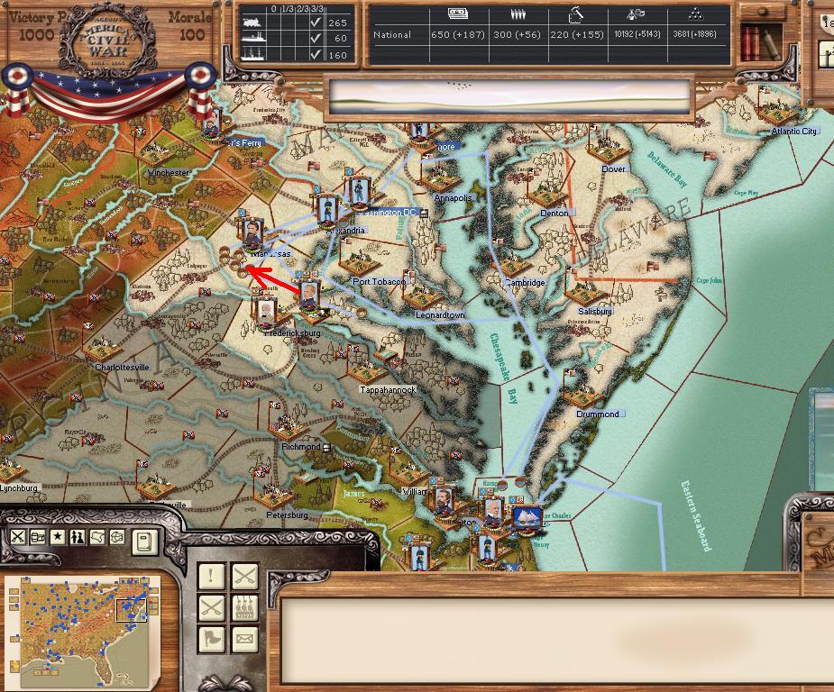 Purchases - 9 5 - element NY Brigades and 5 OH mixed brigades, 3 sharpshooter, 1 cav, 3 artillery, 2 ocean transports - East - I want to cut off the AoNV into pieces, hopefully they are so short of supplies they have no offensive capabilities. Continue to expand coastal landings. West - move over the river at Mason, AL for move on Chattanooga, supply line behind AofTenn should be well cut up. Want to take Jackson and prepare for move on Mobile. Far West - Little Rock will have to wait a few turns, but starting minor moves into TX.