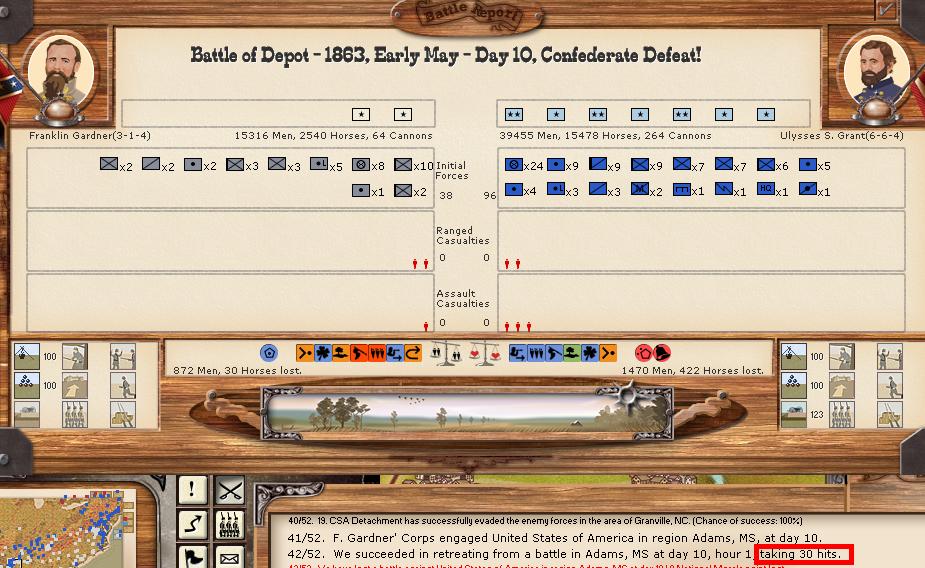 There were 6 minor and 1 major battles this turn. Vicksburg was able to bombard a union fleet and cause 50 hits, while being hit 0 in return.