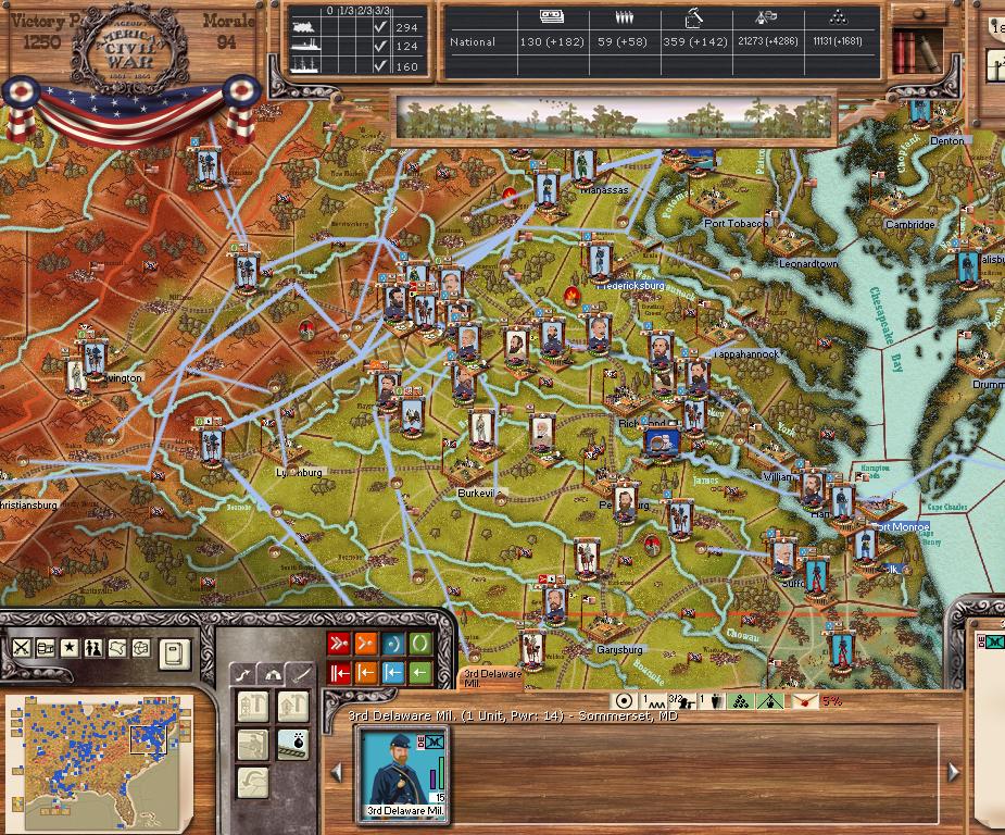 Purchases, river transport, a few replacements and one mixed brigade. East - Tightening ring around Richmond/Petersburg. Continueing deep cav raids and moving forces out of landings at beaufort and beaufort. He has to be hurting for supplies by now, he either has to attack out of Richmond or starve to death. West - raids raids raids, recovering from my attack on Jackson, having a go at Vicksburg now. Consolidating the rest. Far west - begining move towards little rock and consolidation.