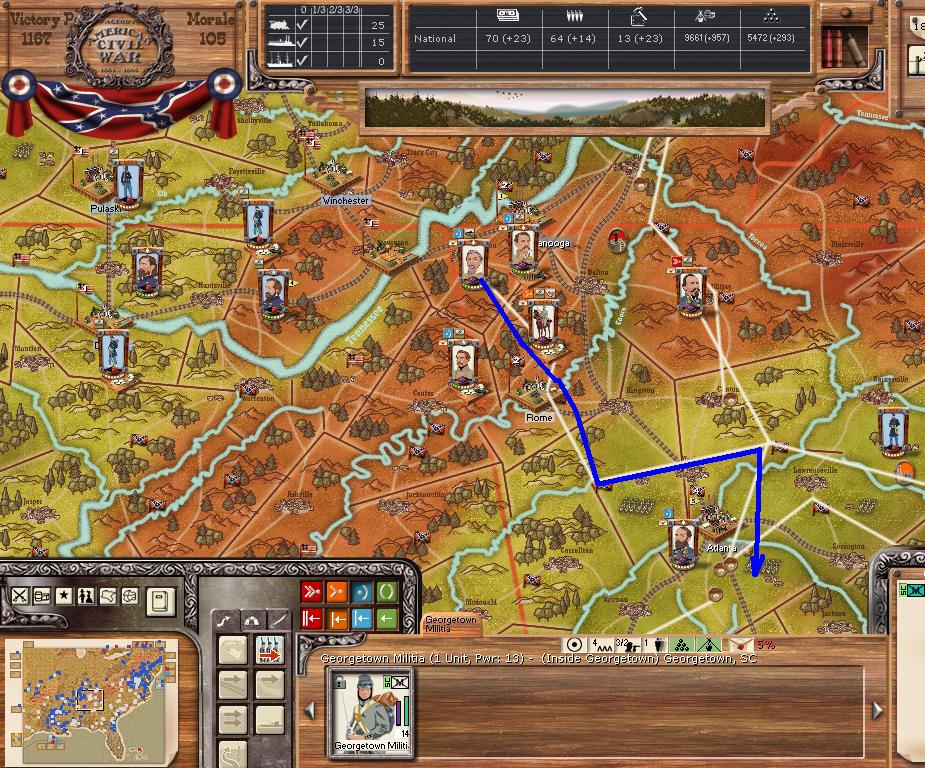 Purchases - locomotives and 8 militia for rail protection. East - He moved back from my flanking movement and going to repeat the move this turn and work closer to Richmond. Starting movement from Norfolk and Ft Monroe to add fronts for him to defend. Bringing Cav forward some for anti-partisan duty, some for large raids. West. AofCumberland, advancing to Stevenson, AL where I will set up a depot and then withdraw most of the Army to another front. MS Command advancing a few regions and Grant still trying to get across the MS. Far West. Ft Smith taken, preparing for move on Little Rock. Butler just messing around in TX/LA