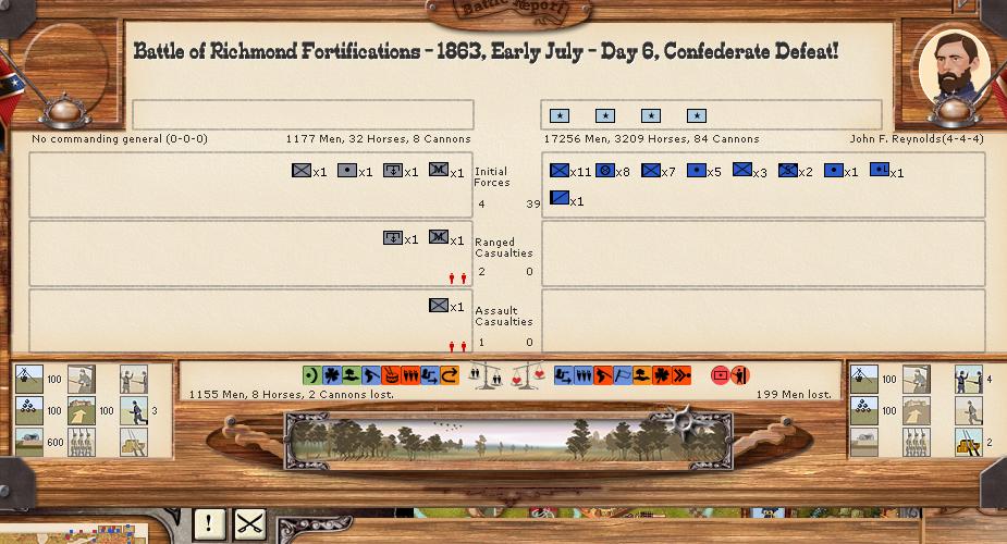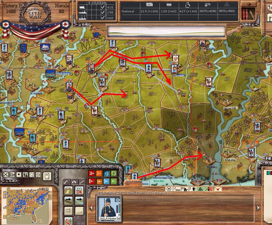My intentions are to defend Vicksburg/Chattanooga/Richmond as long as I can, but saving my army, in order to avoid a morale surrender. The rebel positions have enormous problems with logistics, but I do not receive enough war supply to create enough trains for transport the food I have, but Redeemer will have the same problem.