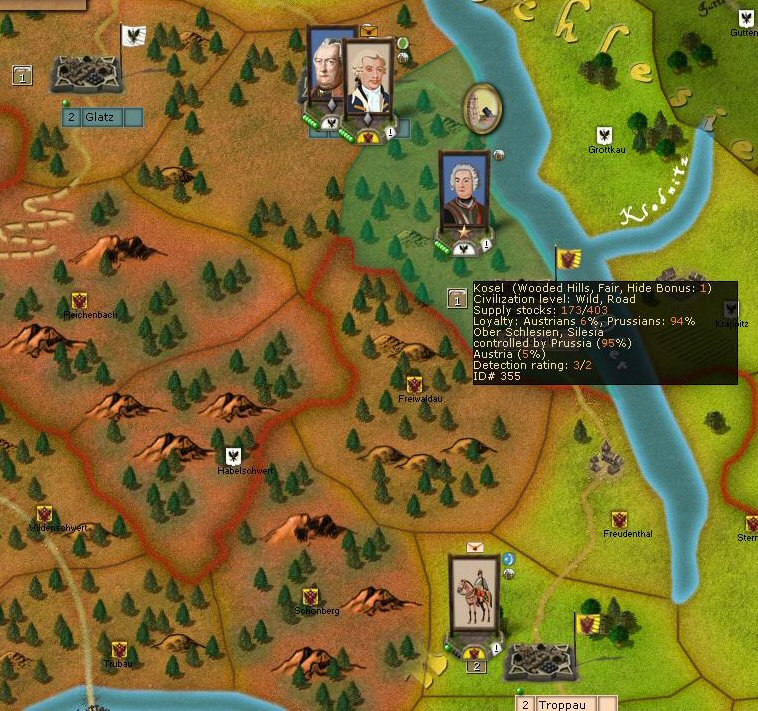 Movement paths don't seem to be right for crossing the Elbe. Kolin to Chlumetz is given as a land route, but Pardubitz to Chlumetz is via a river crossing.