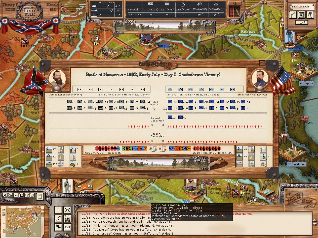 MarkCSA wrote:-Union AI is much more careful in 1861 and 1862, but goes for deep commando raids (with full armies) in 1863, while I am 15 points short of a 200 morale victory. I've taken St. Louis and the two cities that matter in Kentucky (one with VP and one with 2 men/turn) but apparantly, Memphis, Nashville and Vicksburg are more important, even though they are a State and a half away from the front. AI getting desperate? I have yet to see the Union try to get St. Louis back even though I am guarding it with 1 Division.